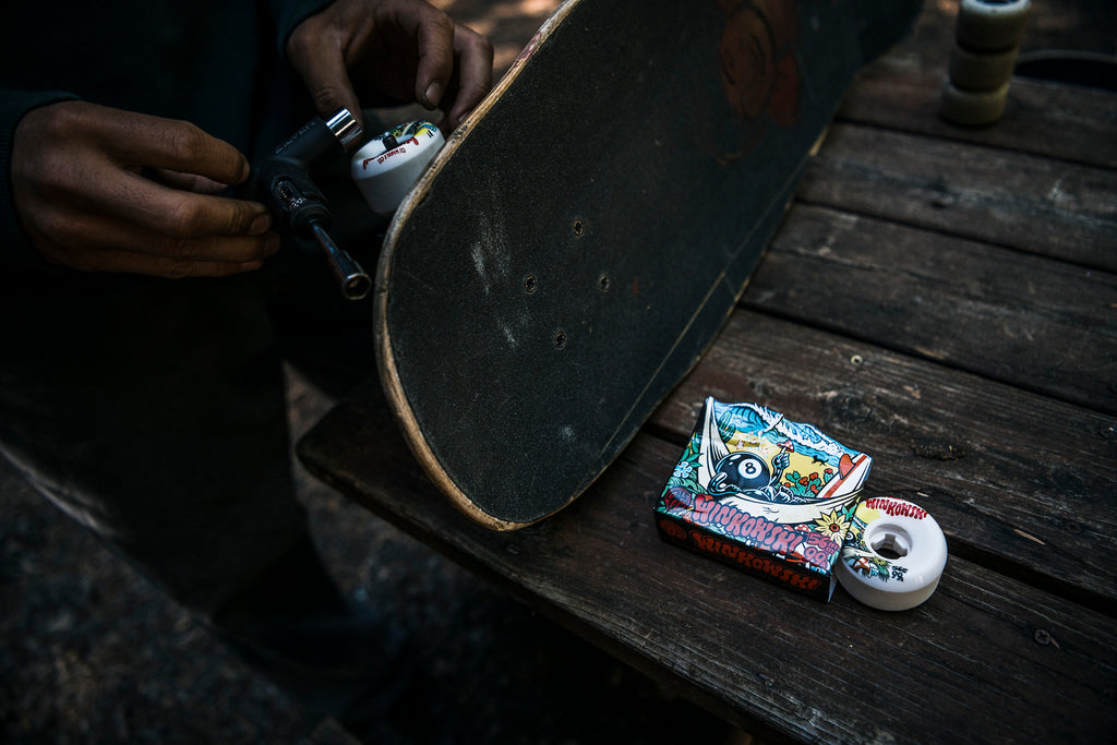 OJ Wheels 56mm, 99a Erick Winkowski Mushroom Pro Elitie Mini Combo wheels with graphics by Santa Cruz Skateboards illustrator Thomas Fernandez @liveradstudios.