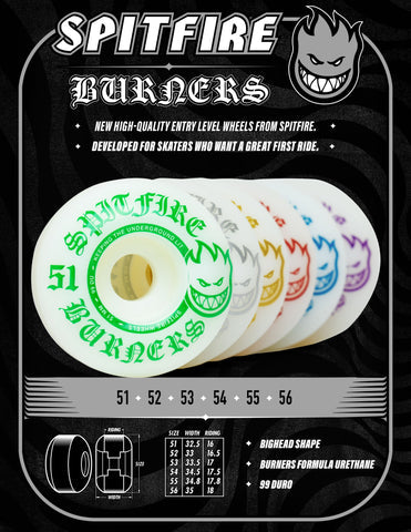 The newly developed Burners offer a new tier in Spitfire's line. Using a unique new urethane, the Burners offer an option for any shop or skater looking for a high-quality entry-level wheel that's great for a first ride and doesn't sacrifice performance for the price.